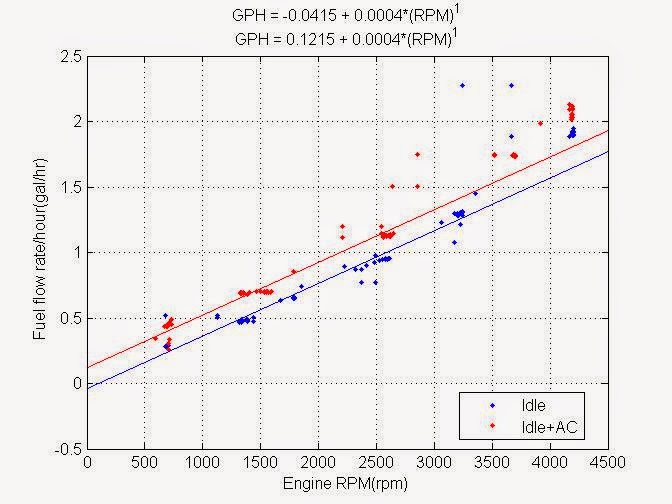 The caption of the figure shows the linear fit equations for the fuel usage with air conditioner off and on. The difference between these two linear fits is 0.16 gallons per hour. This suggests that when the air conditioner is running, no matter what the RPM of the engine is, it is demanding fuel at a rate of 1 gallon every 6 hours.